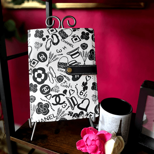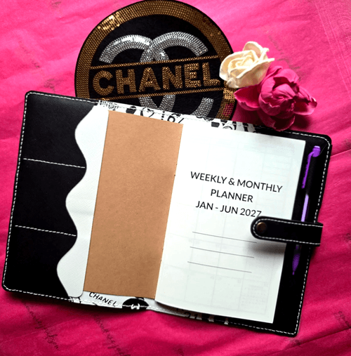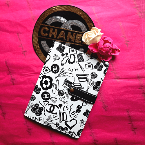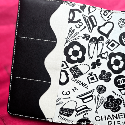 This stunning Chanel planner cover is very functional with three (3) extra card slots and 2 pockets (one on each side) to inset your planner or notebook and any extra paper.