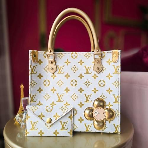 Classic white and gold LV monogram in microfiber leather, with metallic gold lambskin interior.